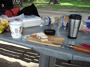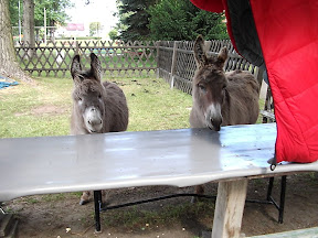 Ich veranstaltete die übliche Putz – und Packsession und zog dann den beschriebenen Weg weiter. Da hier auf diesem Gelände eine Teichwirtschaft war, gab es einen Fischimbissstand, an dem ich nicht recht vorbei kam, obgleich ich eben gefrühstückt hatte. Frischer Fisch ist doch was feines und den gönnte ich mir. Dabei fing es an mit regnen. Wir wurden neugierig beguckt, aber doch recht in Frieden gelassen. Auch als einige Polizisten kamen, kamen keine neugierigen Fragen. Einige spendeten den Eseln und Sulle ihre Brötchen.