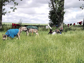 Ich hatte meine Unbekümmertheit noch nicht wieder erlangt und noch etwas ängstlich, deshalb zog ich weiter und kam an einer Landstraße heraus. Dort wusste ich erstmal nicht wohin und ging auf die gegenüberliegende Wiese, um zu rasten mit den Tieren. Wieder hängte ich die Wäsche auf und ließ die Tiere fressen, doch schön war der Platz nicht, denn hier war einiges los und der Platz war verzeckt. Ich dachte so:“Hätte ich nur an dem zauberhaften Ort gerastet, hätte ja nicht dort schlafen müssen.“ Aber hätte, hätte ...