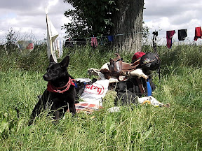 Es war noch so 2km zu laufen, bis ich den beschriebenen Platz fand. Dort lebten viele Kraniche, die allerdings wegflatterten, als sie uns sahen. Ich fand den Platz, allerdings verschlossen und so recht bewohnt kam er mir nicht vor. Zwei kleine Holzhütten standen auf dem Gelände, einige Ziegen, Esel und zwei richtig gute Schutzhunde, die das Gelände bewachten. Und dieses ausgesprochen überzeugend. Ich schaute mir die Tiere genauer an und bemerkte, dass ich sie schon mal gesehen habe und zwar auf dem Mittelaltermarkt in Görlitz. Die Tiere vom Esel – und Wurstkarsten. Er möge mir bitte diesen Namen verzeihen, falls er diese Zeilen eventuell mal lesen sollte. Er verkauft auf den Märkten Wild - , Schafs – und Ziegenwurst. Sehr zu empfehlen. Manchmal betreibt er auch Eselreiten, doch hauptsächlich gibt es leckere Speisen bei ihm und seinen Leuten zu kaufen. Damals war ich mir nicht ganz sicher, dennoch wirkten die Tiere auf mich so. Heute weiß ich, dass es in der tat sein Gelände ist, doch nicht dort wohnt, sondern ganz normal auf einem Hof mit Frau und Kind. Ich hatte ihn dieses Jahr zu Ostern (2008) auf einem Mittelaltermarkt gesehen und ihn danach gefragt. Er bestätigte mir die Lage und den Platz. Hatte ich also doch ein gutes visuelles Gedächtnis.