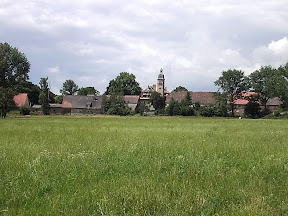 Als ich von dannen zog begann es mit regnen, aber nicht zu stark. Ich hüllte uns ein und so ging es durch einen kleinen Wald, dann durch Watzschwitz, von da ab wieder Landstraße nach Müglenz. Dort gedachte ich zu pausieren. Es ist ein wirklich altes Dorf mit altem Dorfschloss und großen alten Höfen. Als ich durchs Dorf durch war, sah ich zwei Mädels, die mit einem Pferd übten. Ich warnte sie kurz nicht zu reiten, da die Pferde erfahrungsgemäß beim Anblick der bepackten Esel immer panisch wurden. Sie meinten ihr Pferd wäre cool und nicht so schreckhaft und sprangen auf. Jedoch wurde das Pferd doch leicht nervös und begann zu buckeln, wobei das eine Mädchen vom Sattel fiel und sich glücklicherweise nicht verletzte. Danach warteten sie bis wir vorüber gezogen waren. Dann kam eine schöne Kräuterwiese mit ein paar Pappeln, die als Grenze zum Feld dienten. Dort hängte ich meine Wäsche auf, obgleich es immer mal wieder vom Himmel tröpfelte. Doch die nasse Wäsche braucht frische Luft und Wind, um nicht im Plastebeutel mit stinken anzufangen, was ich immer total eklig finde.