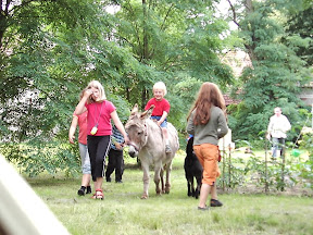 Die Kinder liefen einige Runden mit den Eseln durch den Garten, wobei Sasi am meisten beansprucht wurde, weil Minielas noch zu jung für die recht großen Kinder war. Julianne, die Gastgeberin war voll auf beschäftigt, brachte mir aber noch eine Schlammbowle, die sehr gut gemacht war und lecker mundete. Erst als es die Dämmerung einsetzte hörten die Kinder so langsam auf, wollten was essen und mussten dann auch in die Betten. Ich konnte mich an ihrem Buffet bedienen, blieb aber zögerlich. Irgendwie war ich in der Runde der Erwachsenen schüchterner. Es sind alles alte Freunde aus Schulzeiten, die sich über Anekdoten und gegenwärtige Themen beschäftigten. In dem Nachbargrundstück war die Hochzeitsfeier und die Dorfmusik hallte laut durch die Nacht. Man hörte, dass auf der anderen Seite gut gefeiert wurde und alle Spaß hatten. Hier war es eine Wiedersehensparty. Und das sie so offen gewesen sind, lag wohl eher daran, dass es Thüringer waren und keine Kleinrössner.