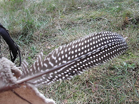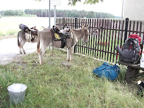 Die unruhige Nacht sorgte dafür, dass ich müde aufstand, ein kleines Frühstück zu mir nahm, die Esel neu an den Bäumen befestigte und mich wieder hinlegte. Der Himmel war übersät von hübschen Wolkenformationen, die viel Platz für meine Phantasien schufen. Irgendwann am späten Vormittag rollte ich mich aus meinen Zelt und machte ganz langsam alles klar, um weiter ziehen zu können. Doch so wie ich alles eingepackt hatte, überraschte uns ein netter Regenschauer und ließ mich in wartender Position ausharren. Zuvor hatte ich natürlich alles abgedeckt, sowie die Eselchen. Es dauert nicht zu lange an und dann konnten wir durchstarten. Auf dem Weg durch Felder und Felder fand ich eine schöne Bussardfeder, über die ich mich sehr freute. Sie nahm ich gerne mit, hatte aber schon eine neue Feder an meiner Fahne befestigt, nämlich eine der gepunkteten.