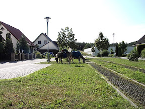 Der Weg durch die landschaftlichen Strecken Brandenburgs hielt sich nicht lange, denn ich musste jetzt weiter in den Westen und dann kam erst einmal nur Straße. Recht stark befahrene Landstraße. Um mich herum Felder und Felder, doch nirgends waren Wanderwege oder ähnliches. An einem kleinen See hielt ich kurz an, um die Tiere ausreichend zu tränken. Dann weiter an der Landstraße, was mich eher stresste, so bog ich dann einfach in ein Waldstück ein, was ein angenehmeres Wandern bedeutet. Doch auch hier kam ich später wieder bei der Landstraße heraus. Nochmals gingen wir an der Straße entlang und die Autos brausten an uns vorbei und immer wieder wünschte ich, dass wir heil durch kämen, da die Autofahrer nicht langsam an uns vorbei fuhren, sondern sehr schnell. Wenn man bedenkt, dass wir laufen und sie in einem Audi oder ähnlichen sitzen, bei welchen man bei 60 km/h noch denkt, dass man durch die Gegend schleicht, ist der Unterschied recht groß.
