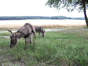 Die unruhige Nacht sorgte dafür, dass ich müde aufstand, ein kleines Frühstück zu mir nahm, die Esel neu an den Bäumen befestigte und mich wieder hinlegte. Der Himmel war übersät von hübschen Wolkenformationen, die viel Platz für meine Phantasien schufen. Irgendwann am späten Vormittag rollte ich mich aus meinen Zelt und machte ganz langsam alles klar, um weiter ziehen zu können. Doch so wie ich alles eingepackt hatte, überraschte uns ein netter Regenschauer und ließ mich in wartender Position ausharren. Zuvor hatte ich natürlich alles abgedeckt, sowie die Eselchen. Es dauert nicht zu lange an und dann konnten wir durchstarten. Auf dem Weg durch Felder und Felder fand ich eine schöne Bussardfeder, über die ich mich sehr freute. Sie nahm ich gerne mit, hatte aber schon eine neue Feder an meiner Fahne befestigt, nämlich eine der gepunkteten.