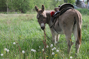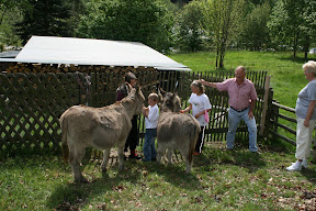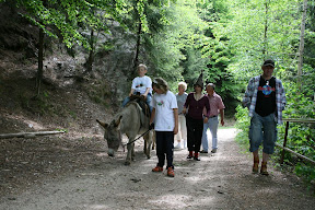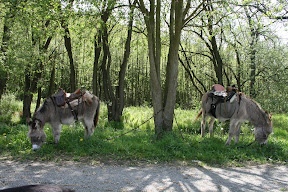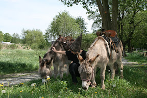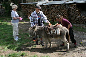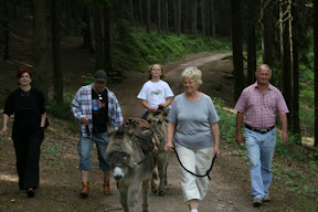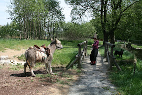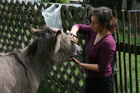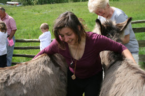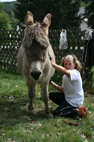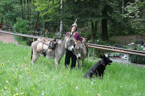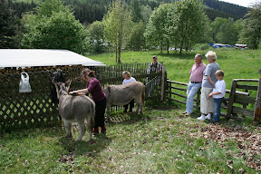 Angelika, ihre Familie und Nachbarn haben uns bereits erwartet und zum Mittag eingeladen. Die Freude beim Ankommen war groß und erregt bei allen. Es wurde heiter drauf los geschnattert, als ob man sich schon lange kennt. Die Esel kamen auf die Weide. Ihr Esel Linda hatte gerade große Probleme mit der Hufrehe und humpelt somit recht stark. Sie hatte das Alter von Sasi, also ca. 18 Jahre, war so goldbraun mit typischen Aalstrich und hatte etwas zu viele Kilos drauf, was wohl die Rehe begünstigt hatte. Vom Charakter her, eine gute Dame, neugierig, aber verfressen. Sasi ist ja auch so, sie hat auch zu viele Kilos drauf, doch zum Glück keine Probleme mit der Hufrehe. Seltsamerweise hat sie während der gesamten Wanderschaft kaum abgenommen, um nicht zu sagen, gar nicht.