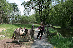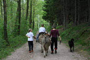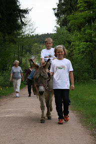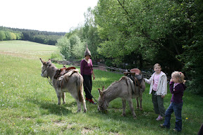 Die Angelika hatten wir auch mal einen Tag besucht, der nicht so verregnet war. Ein Sonntag wars. Wir haben die Esel gesattelt, sind mit einigen der Familie zur „Rentners Ruh“ gelaufen, da ich dachte dort etwas Geld mit Kinder reiten zu verdienen, aber es eben doch mehr Rentner als Kinder da.