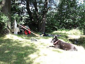 Ich veranstaltete die übliche Putz – und Packsession und zog dann den beschriebenen Weg weiter. Da hier auf diesem Gelände eine Teichwirtschaft war, gab es einen Fischimbissstand, an dem ich nicht recht vorbei kam, obgleich ich eben gefrühstückt hatte. Frischer Fisch ist doch was feines und den gönnte ich mir. Dabei fing es an mit regnen. Wir wurden neugierig beguckt, aber doch recht in Frieden gelassen. Auch als einige Polizisten kamen, kamen keine neugierigen Fragen. Einige spendeten den Eseln und Sulle ihre Brötchen.